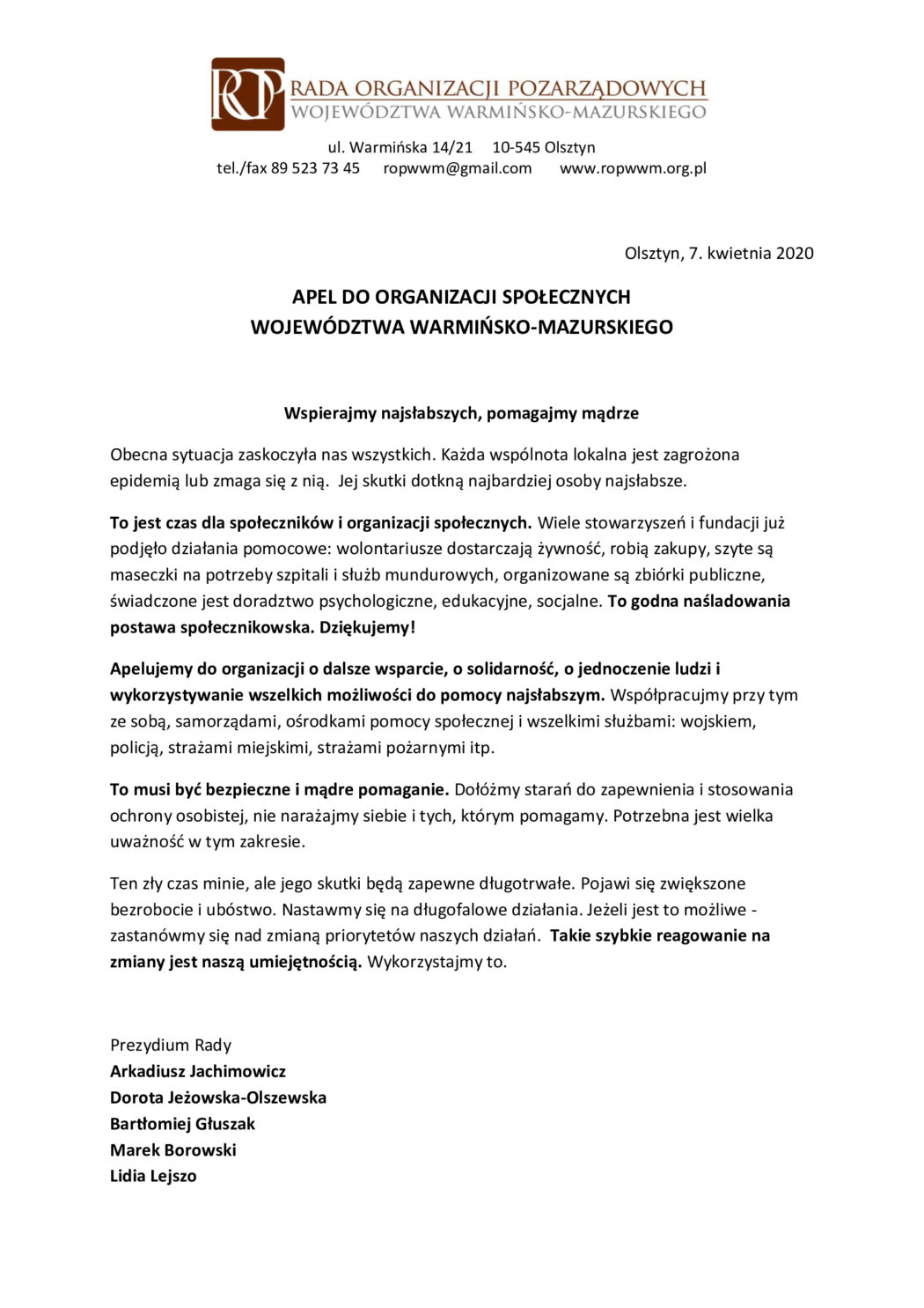 APEL DO ORGANIZACJI SPOŁECZNYCH WOJEWÓDZTWA WARMIŃSKO – MAZURSKIEGO