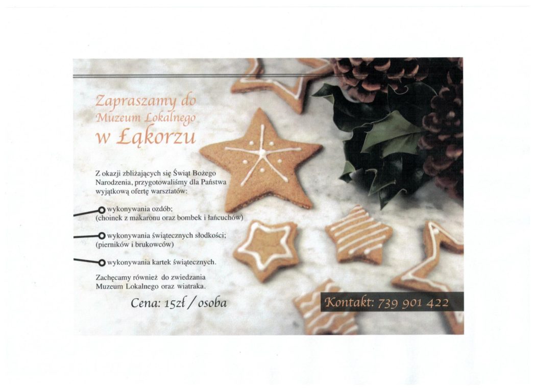 Muzeum Lokalne Ziemi Lubawskiej w Łąkorzu serecznie zaprasza do udziału w warsztatach organizowanych z okazji zbliżających się Świąt Bożego Narodzenia. Warsztaty odbędą się 8 grudnia 2018 r. podczas których będą pieczone pierniczki.